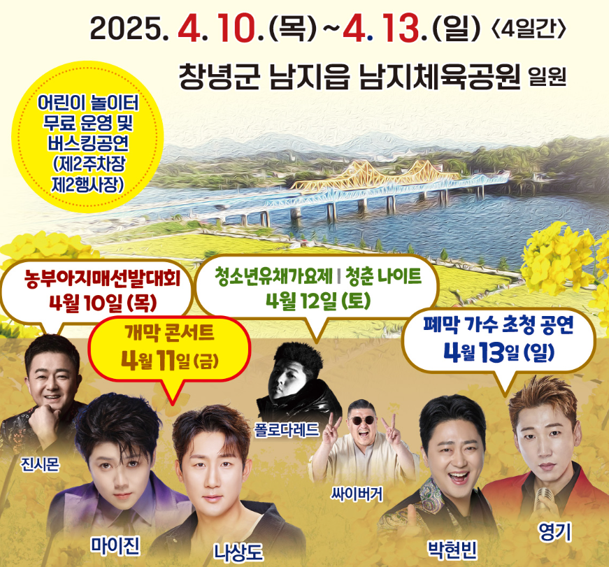 - 장소: 경남 창녕군 남지읍 낙동강 유채단지 & 남지체육공원